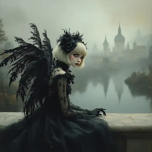 surreal gothic-styled softly misty oil painting with muted colors of a surreal, whimsical black cat with small but elaborate wings and a surreal, whimsical young girl with short, luminous blonde, bob haircut-style hair, big eyes, softly blushed cheekbones and similar wings like the cat, sitting on a long, marble bench above a lake, against a misty townscape. the girl has a black headdress and she is wearing a gothic styled black lace dress and black hosiery. hyper detailed, aesthetic, 8k