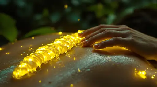 hotorealistic, cinematic close-up: a person lying prone on a damp forest/jungle floor. Camera slightly top-down (~30°), framing the upper back. The person wears a wet dark teal linen/cotton shirt with fine weave texture. Along the spine: bioluminescent, golden-yellow to neon-green viscous resin/energy “ribs”, segmented like vertebrae, with thick glowing drips running sideways. Soft bloom/glow around the light, tiny air particles. From the right, a right hand (slender, light skin, short nails) rests gently on the glowing mass; the hand is underlit by the gold shine, tendons catching specular highlights. Background heavily out of focus with green leaves, very shallow depth of field, bokeh specks, subtle volumetric rays. Color grade: emerald & deep teal shadows, intense gold highlights; wet fabric speculars and micro droplets. Head partly cropped, no face visible. Mood of healing/magic energy, cinematic still, hyper-real, ultra-detailed.