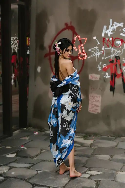 2 months ago Full body view An alluring Asian woman in a very short blue and black kimono, partially slipping off her bare shoulders and back, turns her head to look back over her shoulder. Her long black hair, flowers in hair, is styled in an elegant bun, and her expression is both serene and seductive. She stands barefoot (((show foot))), foot on stony floor, in a surreal, expressionistic setting with random textures and graffiti, evoking a sense of impermanence. Soft, warm lighting from a single overhead source casts gentle shadows, enhancing the intimate and ethereal atmosphere. The scene is framed with a subtle film grain and a rich, deep red and black color palette, reminiscent of the styles of Franz Marc and Max Ernst. MegaWolf 0 42