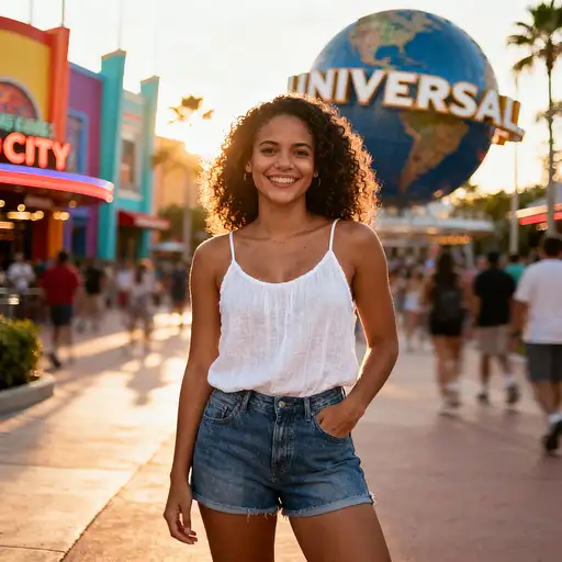 A hyper-realistic, professional photograph of a warm-smiling Brazilian woman in her late 20s, standing confidently in the center of the bustling walkway at Universal Studios Orlando's CityWalk. She is dressed in stylish, casual summer attire: well-fitted denim shorts and a simple white linen tank top. The scene is captured during the golden hour, with the warm, low sun casting long shadows and creating a beautiful, luminous glow on her skin and the environment. She looks directly at the camera with a genuine, inviting smile, creating a connection with the viewer. In the background, the iconic CityWalk architecture is visible—vibrant colors, the Universal globe, and restaurant signs—with the crowd of tourists artfully blurred to suggest motion and energy without distracting from the subject. The image is perfectly framed, with a shallow depth of field (bokeh) that isolates her sharply against the soft, colorful backdrop. Technical Specifications: Photographic Style: Photorealistic, candid portrait. Lighting: Natural, golden hour sunlight, warm and flattering. Lens Simulation: 85mm portrait lens for natural perspective and beautiful background compression. Quality: Ultra-high resolution, incredible detail in the eyes and skin texture, professional color grading.