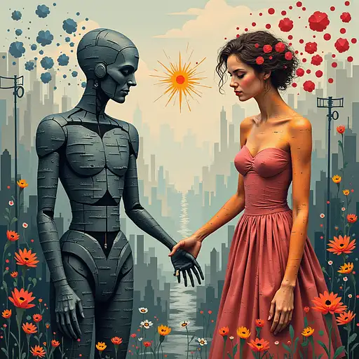 5 months ago Create a symbolic digital artwork in the Cubist-Pointillist style of Marie âMarevnaâ Vorobieff, inspired by her 1917 painting "Death and Love". The_Promptonaut 0 18
