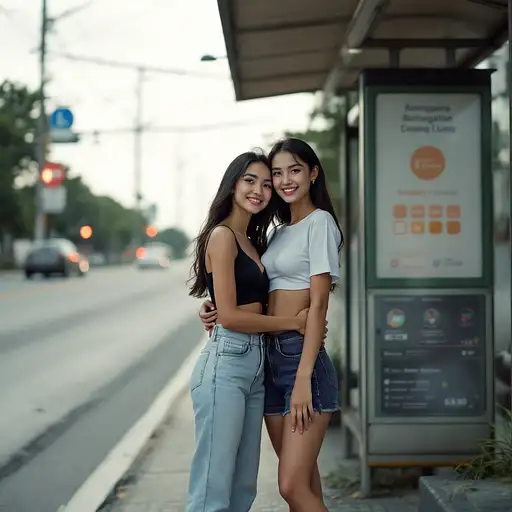 7 months ago Fulll body view two beautiful indonesian women wearing a cropped top and short jeans, barefoot, big breast, standing in front of the bus stop, in the style of Oleg Oprisco, video, Jocelyn Hobbie, soft, muted tones. they hug and , smiling to the camera wildcat2 PRO 1 51