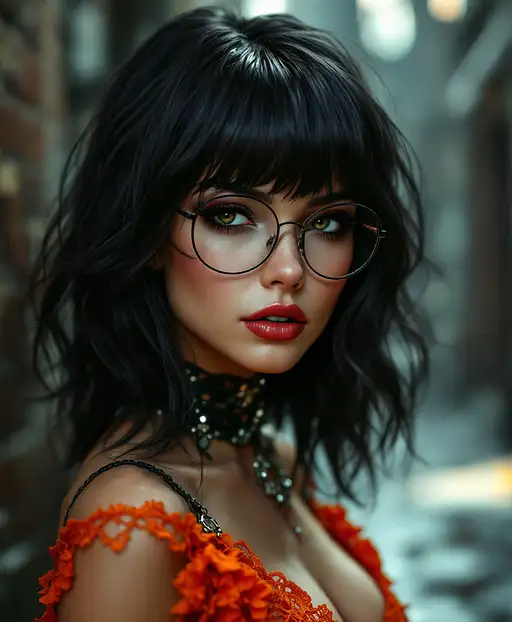 6 months ago Photo of a ultra realistic of velma from scooby-doo, very sultry look, so hot girl, beautiful charismatic girl, so hot shot, showing piercing, athletic body, a woman wearing eye glasses and an orange lace, gorgeous figure, full body shot, goth style mood, dark eye makeup, in the style of Adriana Lima, life-size figures, 4k, hyper realistic, focused, extreme details, unreal engine 5, cinematic, masterpiece,, intricate MackBearth 2 55