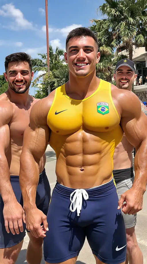 Three incredibly muscular and handsome bodybuilders in their early 20s, radiating strength, energy, and camaraderie, strike an athletic pose in a **vibrant and sunny outdoor environment**. They are of **diverse ethnic backgrounds**, with each of the bodybuilders showing off their heavily muscular, shredded bodies, which are perfectly highlighted by their athletic outfits. Their smiles reflect a sense of fun, joy, and connection, making the scene feel like a celebration of friendship and positivity. The first bodybuilder is of **Caucasian descent**, with a well-defined jawline, piercing **green eyes**, and a square, masculine face. His **short, dark brown hair** adds to his rugged yet charming look. He stands confidently in **a fitted yellow athletic shirt** and **tight, navy blue shorts** that accentuate his **powerful legs** and **muscular thighs**. The **Brazilian flag emblem** and the word “BRAZIL” are printed on the shirt, and the **Nike logo** is proudly displayed. His massive chest, defined abs, and thick arms are all visible, and he stands with one arm around his friend, his joyful, confident smile highlighting the bond they share. The second bodybuilder is of **Black descent**, with a chiseled, symmetrical face, **dark brown eyes**, and a strong, full beard. His face radiates confidence, with a sharp jawline and a well-defined cheek structure. His **short, curly hair** perfectly complements his athletic physique. He wears a **tight, white athletic shirt** with **bold green shorts**, the bright colors enhancing his glowing skin. His **wide chest**, **ripped abs**, and **thick thighs** are perfectly showcased. He shares a moment of camaraderie with his friends, grinning ear to ear, his muscular build reflecting the hard work and dedication it takes to achieve his physique. The third bodybuilder is of **South Asian descent**, with rich **brown skin** and a striking face. His strong jawline and deep, confident **brown eyes** are complemented by his **short, black hair**. He is dressed in a **fitted white athletic shirt** and **green shorts**, emphasizing his **well-defined biceps**, **sculpted legs**, and **strong core**. The **Brazilian flag emblem** and the **Nike logo** are clearly visible on his shirt. His energy and infectious smile bring warmth to the scene as he stands beside his friends, their shared happiness and support for one another evident through their joyful interaction. They are positioned against a **beautiful backdrop of a bright, sunlit park**, with clear blue skies and soft, natural light accentuating their muscular builds. The soft **pastel tones** in the image bring out the warmth and happiness in the scene, while the **high-key lighting** ensures their bodies and expressions are perfectly illuminated, with no harsh shadows. The warm sunlight bathes their glowing skin, highlighting every detail of their powerful muscles, from their thick thighs to their broad shoulders, creating a **vibrant**, **friendly**, and **energetic** atmosphere that captures the essence of their strong friendship and athleticism. The scene is filled with **positive energy** and **bromantic** vibes, their strong physiques and **muscular bodies** taking center stage, as they embrace their connection, standing tall together with smiles of pride and joy.