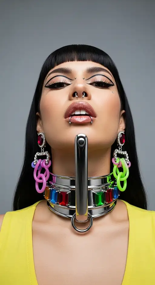 Create a hyper-stylized 3D floating head of a bratty, glamorous female avatar with a bothered, unimpressed expression — half-lidded eyes, arched brows, and a subtle lip curl that conveys classic 'mean girl' attitude. Her skin is fair, porcelain-smooth with a glossy, almost airbrushed vinyl finish. Highlighter is dramatically applied to her cheekbones and the tip of her nose, catching the soft studio lighting with a dewy, reflective glow. It has a text behind: Write "PROMPTHERO" in caps in Bold Black Helvetica behind the subject, covered by the head but visible enough to read it Her eyes are adorned with shimmering holographic eyeshadow — iridescent and multidimensional, shifting from purples to teals with realistic specular glints. Her thick, jet-black hair is slick, glossy, and styled with precision, falling in sculpted waves or a sleek updo, reflecting light like polished acrylic. A small metallic nose piercing (stud or hoop) sits on one nostril — the surface is chrome-like, with subtle reflections and a brushed metal texture, adding a touch of edge to her polished look. The head is fully isolated with a 15 degree tilt - floating cleanly against a plain white neutral background, mimicking a premium product render. The lighting is bright and diffuse, like a fashion studio setup, with no harsh shadows — emphasizing the gloss and plasticity of surfaces. Use subsurface scattering to give the skin depth and warmtxh Mood: bratty, fashionable, coolly detached Camera angle: close-up portrait, straight-on view. Focal length: 85mm, to slightly compress facial features and enhance softness. Textures: ultra-smooth, cartoon-style with high gloss, smooth plastic surface finish skin, lips, and hair.