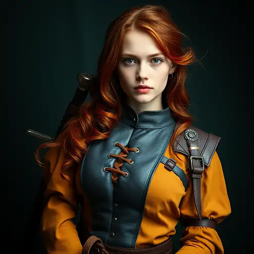 This is a highly detailed, 8k photograph of a young woman with striking red hair, styled in loose waves that flow to one side. She has fair skin and a strong, determined expression on her face. She is dressed in a medieval-inspired outfit that includes a dark grey leather breastplate with intricate metalwork, which covers her torso. Over this, she wears a mustard-yellow, long-sleeved blouse with a high collar and laces running down the front, adding a rustic, historical touch. Her arms are adorned with leather straps and buckles, and she carries a sword with a black hilt and a silver crossguard on her back. The sword's sheath is visible, strapped diagonally across her back. The background is a solid, dark green, which contrasts sharply with her outfit, making her the focal point of the image. The texture of her clothing, particularly the leather and fabric, is well-rendered, adding depth and realism to the photograph. The overall style is a blend of fantasy and historical accuracy, with a focus on the rugged, adventurous nature of the character., Fashion photography, surrealistic, hyper-realistic, photorealism, high resolution, shot using a Canon EOS R5 F2 ISO300