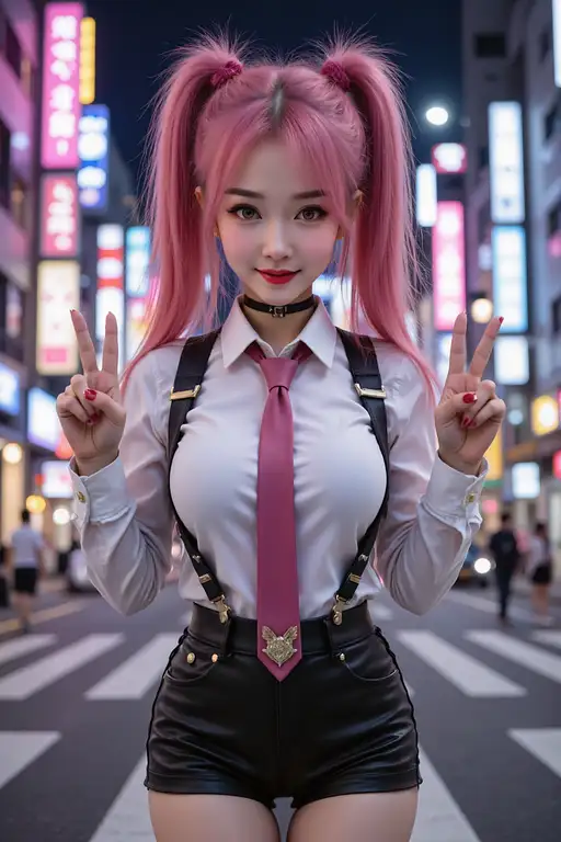 Style: Masterpiece, best quality, ultra-detailed, sharp focus. Subject & Pose: A close-up shot of an extremely energetic and cute Chinese woman. She is standing confidently in the middle of a street, facing the camera with a big, joyful, open-mouthed smile. She is playfully making a "V" for victory sign with both hands, holding them up on either side of her face. Appearance & Features: Hair: The most striking feature is her long, voluminous, and luscious bright bubblegum pink hair. It's styled into high, flowing twin-tails, each tied with a large, dark magenta ribbon and a small gold-colored clip. She has full, neatly-trimmed bangs that frame her face. Eyes: She has large, expressive anime eyes that are a beautiful, sparkling shade of deep violet or amethyst, detailed with intricate highlights that give them a lively and captivating look. Nails: Her fingernails are neatly manicured with dark red polish. Outfit & Accessories: A stylish, modern, and slightly edgy take on a uniform: Top: A crisp, white, long-sleeved collared shirt. Harness & Tie: Over the shirt, she wears a black tactical-style body harness with straps over her shoulders and chest, featuring clips and what appear to be ID card holders. She wears a vibrant pink tie with a diagonal white stripe pattern, clipped neatly. Choker: A simple black choker with a small, delicate bow at the front. Bottoms: Tight-fitting black shorts made of a leather-like material, adorned with a wide black belt with two large silver buckles. A garter-style strap is visible on her right thigh. Setting & Lighting: The scene is set on a Japanese city street at night. The background features towering city buildings with glowing neon signs and advertisements in shades of pink, purple, and blue. The bright, artificial lights of the city cast dramatic, high-contrast lighting on the character, creating sharp highlights on her hair and clothing, and deep shadows, which adds to the dynamic and immersive atmosphere. The street in front of her has visible crosswalk lines. The sky is a deep, dark blue, dotted with a few stars. <lora:foollady-v10:0.9> <lora:camera-effect:0.5> <lora:Huge_natural_breasts_for_FLUX_v2:0.15> <lora:aidmaFLUXPro1.1-FLUX-v0.3:0.4> <lora:FLUX.1-Turbo-Alpha:1>