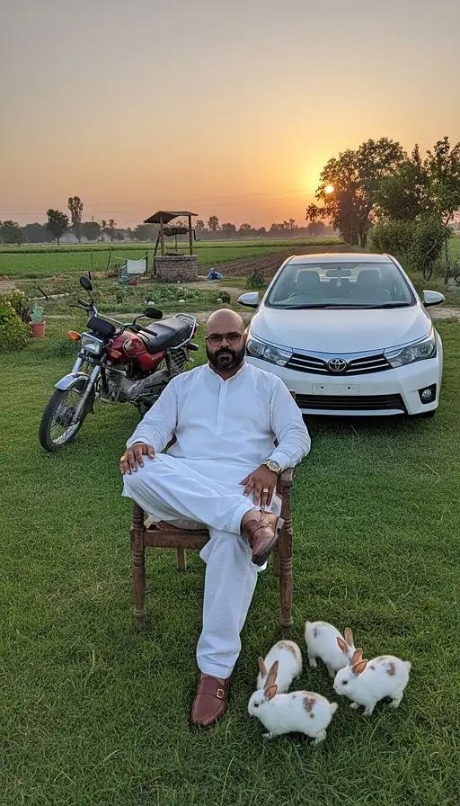 19 hours ago A ultra Realistic man Sitting on chair in green garden very big, Wearing White Punjabi clothes with golden color watch, In front of man A small Rabbits are playing in back side of man A bike cdi 70 and One Corolla Grendy in white color parked 70 inches far from person, all pick take in Punjabi farm land, add details which are present in fram Time around sunset, The face remaining same which is in the picture,Ultra-realistic vibe all pictures look ultra Original wearing Branded Shoes the face should be 100% match with reference photo bads 0 2