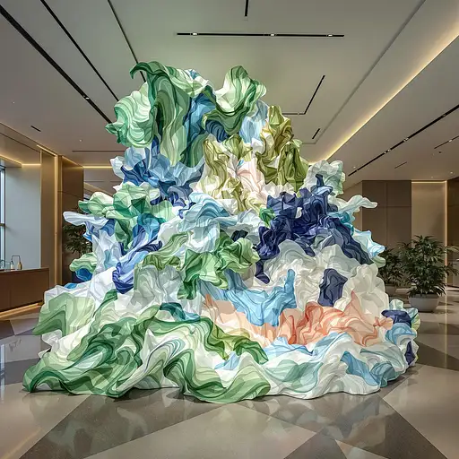 3 months ago The spatial design features a colorful silk fabric sculpture located in the hotel lobby, taking the form of a quick sketch of traditional Chinese green-and-blue landscape painting. It was created by Sou Fujimoto and presented in a gallery art display with ultra-high resolution images and blurred details, exuding a strong sense of design. 5de750a9bce 0 20