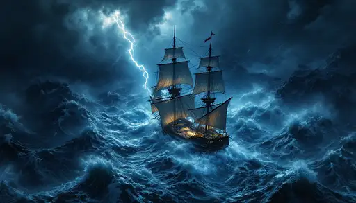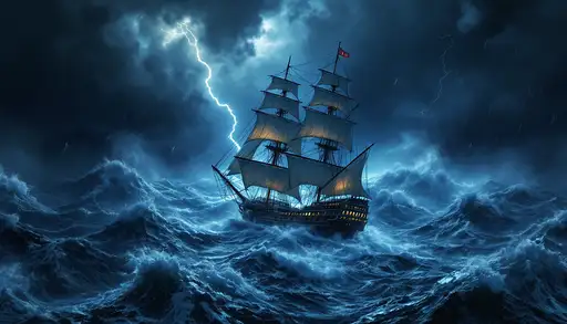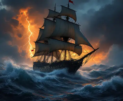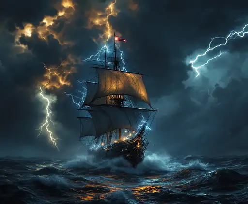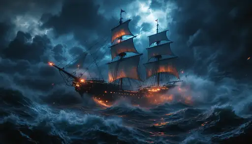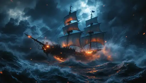 Photo of a ultra realistic sailing ship, dramatic light, pale sunrise, cinematic lighting, battered, low angle, trending on artstation, 4k, hyper realistic, focused, extreme details, unreal engine 5, cinematic, masterpiece, art by studio ghibli, (Score_9, score_8_up), score_7_up, score_6_up, featuring a villainous male character with glowing yellow eyes and tribal tattoos. He is shirtless, showcasing his muscular build with large pectorals and abs, and adorned with a golden skull mask and all-black attire. The character has very long, braided black hair that floats and spreads around him. He holds a staff and is wearing Aztec-style armor with feathers and multiple large wings. The background is dark and blurry, with a purple hue and dramatic lighting that emphasizes depth of field (dof) and detailed line work. The overall theme is dark and ominous, with elements of unholy and culture punk styles. The scene should be enhanced with the following settings: lora:sdxl_lightning_8step_lora:0.9, lora:Art_Adams_Style_Pony_XL:0.4, lora:Dark_Anime:0.2, lora:glowneon_xl_v1:0.2, lora:unholy:0.4, lora:CINE:0.2, lora:Gas_mask-000009:0.3, and lora:CulturePunkAI_1:0.6.