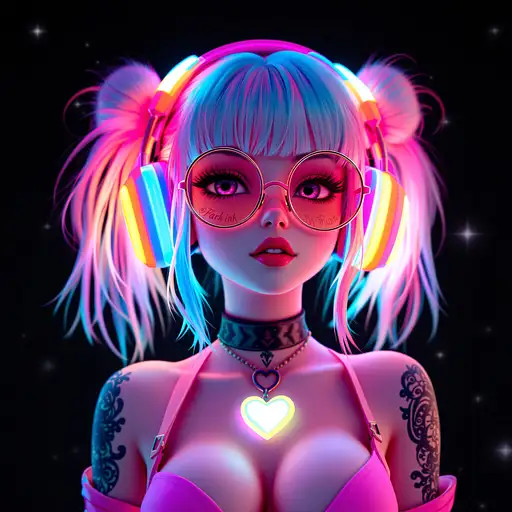 1 month ago A vibrant and dynamic 3D rendered anime character with striking pastel blue and pink hair styled in playful double buns. She wears oversized round glasses and large, glowing headphones adorned with colorful LED lights. Her skin has a soft, luminous quality, accentuated by intricate tattoos. The character sports a revealing pink top and a dark choker necklace, complemented by a heart-shaped pendant that glows softly. Surrounding her, a backdrop of deep black enhances the vivid colors and the magical, glowing elements, creating an atmospheric and futuristic vibe. The lighting emphasizes her features and adds depth to the scene. 3fbe4ec3cf5 0 35