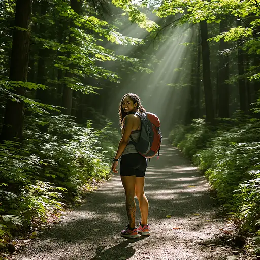 19 days ago A hyper-realistic, professional photograph of a beautiful Brazilian woman in her mid-20s, standing on a sun-dappled gravel walkway in the center of a lush, vibrant state park forest. She is dressed in functional and stylish hiking clothes: a moisture-wicking athletic top, durable hiking shorts, and sturdy trail-running shoes. A lightweight backpack is on her shoulders. The lighting is dramatic and cinematic; sunbeams break through the dense canopy of trees, creating a "god ray" effect that illuminates the path around her and highlights the bright, emerald green foliage. The air is slightly misty with particles catching the light. She has just turned to face the camera, her expression is one of peaceful confidence and she offers a warm, genuine smile, her eyes crinkling slightly. The image is captured with a shallow depth of field, isolating her in sharp focus against the softly blurred, verdant background. Style: Photorealistic, dramatic natural lighting, high detail, outdoor adventure photography. Shot on: A Sony Alpha 1 with a 85mm f/1.4 lens. tiertwo 0 24