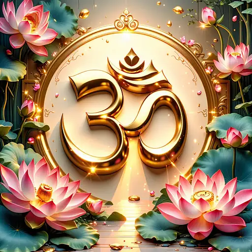 6 days ago The central symbol is a golden sign "ॐ (Om)", made in 3D volume with soft highlights, shine and polished metal effect. The palette is warm gold and amber shades, complemented by rich accents (pink and scarlet flowers, green leaves, light blue tints). Ornamentation - around the symbol there is a rich frame of flowers (lotuses), decorative elements, patterns, glowing particles. Everything is made with high detail. The effect of radiance is a feeling of divine light emanating from the center, with soft gradients and backlighting. The background smoothly transitions from dark gold to bright light. The atmosphere is solemn, spiritual, mystical. Visually it looks like a combination of Eastern sacred art with modern digital art. The style can be called digital fantasy art / sacred art, with elements of 3D rendering, hyperrealism and decorative illustration. 9a3d15de54a 0 9
