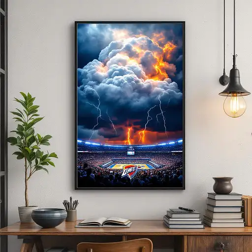 Epic dark fantasy oil painting capturing the raw, mythological power of Thor, the Norse god of thunder. The setting is a wild, snowy Scandinavian landscape engulfed in a fierce blizzard, with snow whipping across the scene in chaotic gusts. The stormy sky is thick with heavy clouds, nearly obscuring the distant mountains, and cast in deep, moody blues and grays. Thor is seen from a low angle, making him appear larger-than-life and truly god-like, towering over the viewer with an aura of unstoppable strength. His powerful, muscular frame is emphasized by his pose, legs planted firmly in the deep snow as he raises Mjölnir, his legendary battle hammer, high into the turbulent sky. He is fierce and resolute, his hair and fur-lined cloak whipping wildly in the freezing wind. A massive bolt of lightning crashes down from the storm clouds, connecting with Mjölnir and bathing Thor in a blazing, blue-white glow that pierces through the blizzard. The intense light highlights his rugged features and casts dramatic shadows across his face and armor, giving him a godly, otherworldly presence. The lightning arcs around him, crackling with raw energy as snow and ice are blasted into the air from the sheer force. Thor’s attire is inspired by traditional Norse mythology, with a thick fur cloak, leather armor reinforced with metal, and sturdy boots fit for a winter warrior. His gaze is fierce, and his entire posture exudes strength and defiance against the raging storm. The color palette is cold and intense, dominated by icy blues, sharp whites, and deep shadows. The lightning illuminates Thor in a spectral light, creating a sharp contrast against the darkness of the blizzard. Snow swirls violently in every direction, caught in the powerful light, adding dynamic movement and depth to the scene. Every detail is meticulously rendered: the rippling muscles, the coarse texture of Thor’s fur cloak, the chaotic streaks of lightning, and the fierce, swirling snow. The composition conveys the raw, untamed power of the Norse god, capturing the viewer’s attention with the overwhelming force of mythic heroism and natural fury.