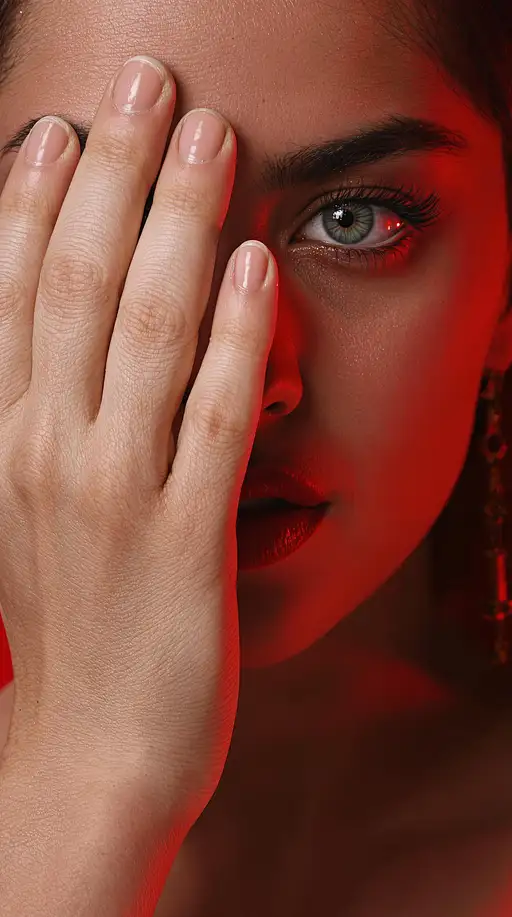7 months ago image of a woman with a thoughtful expression, covering half of her face with her hand, pure red background to emphasize facial details and create a mysterious vibe, realistic, UHD, rich detail --ar 9:16 --v 6 5d0fa63527e 1 39