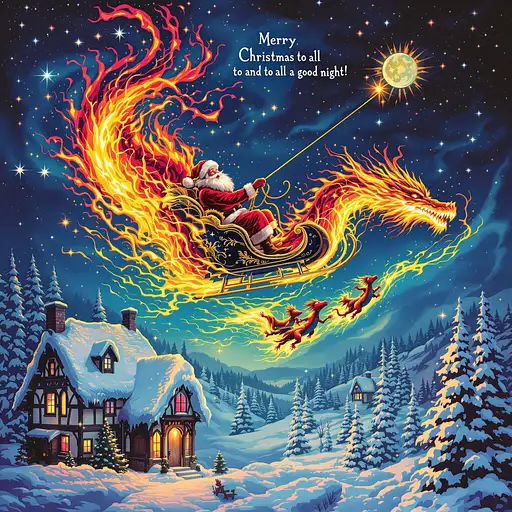 6 days ago Merry Christmas to all and to all a good night in print on top of the picture. Psychedelic, surreal Christmas card Santa Claus in sled flying over a house with a fire dragon, and baby dragons leading the sled. in the style of 32k uhd, quadrature, lively and energetic --chaos 75 --ar 9:16 --profile yruxpc2 --stylize 750 --v 6. 1 deep color. 01f9c64afc8 PRO 0 7
