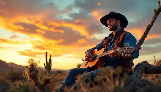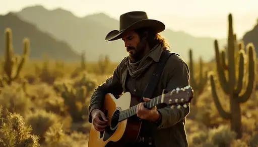 9 months ago Estilo: western. Escenario: desierto al atardecer con cactus. Un hombre con una guitarra está apoyado sobre un árbol seco. Está sentado en el suelo y apoyado sobre el árbol seco. No se le ve la cara. Su camisa debe ser azul marino y su chaqueta debe ser marrón oscuro, además debe llevar un pañuelo rojo oscuro en el cuello y un sombrero de cowboy. 597297a32d0 PRO 1 15