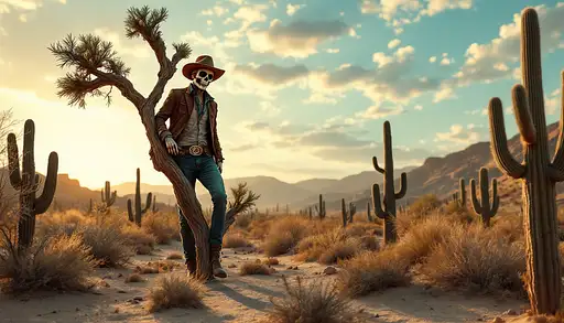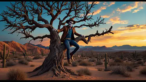 9 months ago Un hombre con cara de calavera caminando apoyado en un árbol seco en mitad de un desierto. Quiero que lleve una guitarra en una funda y que se vean cactus. Quiero que la escena sea al atardecer y que sea jovial. Estaría bien, ya que están en el desierto y al atardecer, que aparecieran cactus. Quiero que el estilo sea tipo western. Su camisa debe ser azul marino y su chaqueta debe ser marrón oscuro, además debe llevar un pañuelo granate en el cuello y un sombrero de cowboy. La guitarra debe estar en una funda y la debe llevar en la mano derecha. 597297a32d0 PRO 1 28
