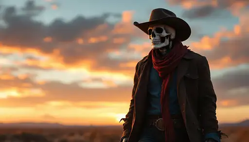 9 months ago Estilo tipo western. Paisaje: desierto al atardecer. Un hombre con cara de calavera camina en el desierto. Lleva vaqueros, una camisa azul marino y una chaqueta marrón oscuro. También un pañuelo rojo oscuro en el cuello. distant view 597297a32d0 PRO 1 26
