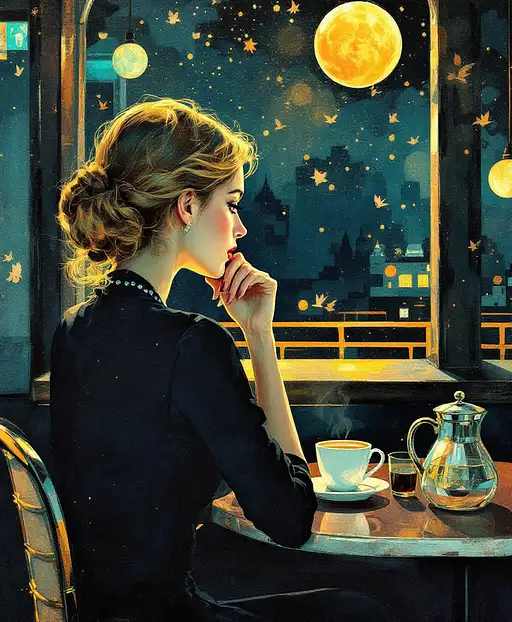 7 months ago Prompt: (Masterpiece), ((“” Automat 1927,Painting by Edward Hooper depicting a lone woman looking at a cup of coffee in a diner at night.)), Inspired by the stylish illustrations of Gustav Klimt, Nicoletta Ceccoli, Catrin Welz-Stein, Dee Nickerson, Luis Royo, Use stunning and masterpiece colored alcohol ink painting. Morgue PRO 0 42