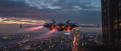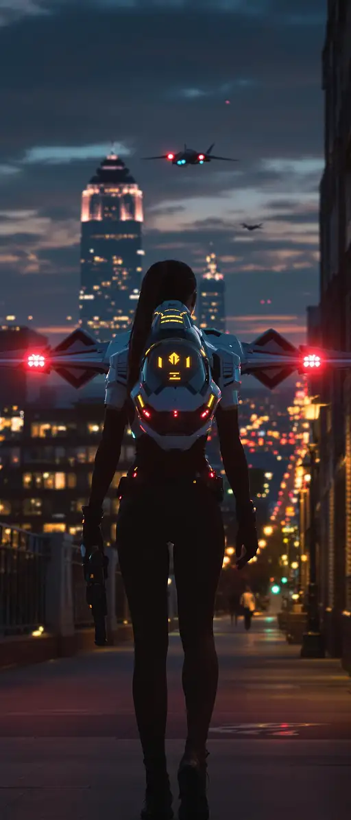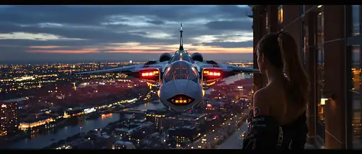 a professional photo of a (futuristic),(masterpiece), photo of a alien fighter aircraft at dusk, with red and yellow lights, flying over the city on New York, 8k, (high res),ultra-detailed, photo-realistic, highly detailed, volumetric, dramatic lighting e, (futuristic),(masterpiece), (realistic), (perfect anatomy), (Full body viewing from head to feet), with extremely brown hair in a ponytail, large beautiful brilliant Forest Tea red-green-blue-silver-brown-golden-grey eyes, flawless olive skin, (dressed in the style off a American secrete service girl) (standing on a sidewalk, protecting a private school) 8k, (high res),ultra-detailed, photo-realistic, full image view, full body view, front view, highly detailed, volumetric, dramatic lighting