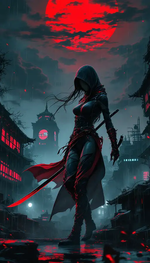 6 months ago a female assassin ninja in red and black ninja outfit, at night, black and red buildings , dark foggy sky, cyberpunk, fluorescent light, dynamic color palettes, red sky, red clouds, red moon, ominous weather, raining, anime inspired, hybrid art, (hyperrealism:0. 5) fb44f8f7762 0 22