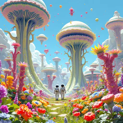 Full body view A stunning futuristic depiction of a female astronaut aboard an advanced spacecraft, wearing a sleek, form- fitting, and partially revealing neon pink holographic spacesuit. The skin is a white armor but contain her dripping pelvis.The suit is designed with a futuristic aesthetic, blending cutting- edge technology and elegance. The material is a smooth, see-through fabric with a subtle sheen, accentuating her athletic physique. The outfit features deep cutouts in the chest and side areas, exposing skin in a way that highlights her form while maintaining a futuristic and functional look. The high collar and structured panels give it a space- age appearance, while the open design emphasizes freedom of movement and aesthetic appeal. Her left arm is partially wrapped in a textured band, resembling a combination of fabric and lightweight armor, adding detail and a sense of functionality. Barefoot. The exposed areas of her skin contrast with the polished white fabric, giving the outfit a bold and daring look, yet it remains cohesive within the context of the sci- fi setting. Her confident pose, with both arms resting on her head, enhances her commanding and elegant presence. The background is the interior of a high- tech spacecraft, with glowing control panels, intricate machinery, and large observation windows offering a breathtaking view of a nebula galaxy against the starry expanse of space. The lighting is dynamic, with soft highlights reflecting off her suit and metallic surfaces, adding depth and realism to the scene. The overall atmosphere is a blend of elegance, advanced technology, and the thrill of space exploration, evoking themes of humanity's push into the cosmos and the resilience of the human spirit. extrem fantastic view over an alien landscape on anaother planet ,far away in a distant galaxy,very colourful,mountains,clouds,glowing sea,exotic plants and creatures,an abanoded ancient, ruins from an alien race,2 human astronauts are walking throught this scene,nebulas,alien sky ,a ver big gasplanet in the horizont and a blue and red sun,flying alien birds ,giant insects and alien fauna and flora