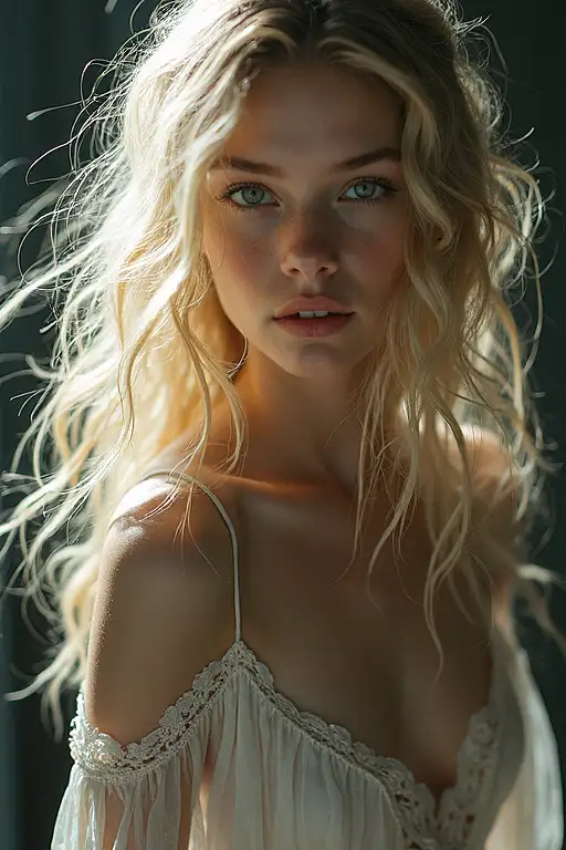 A moody, cinematic fine art photograph (2.0), featuring a stunning, dark-haired woman (1.8) with delicate facial features and deep, expressive eyes. She sits on a luxurious, dark leather couch (1.7) in a softly lit room, her pose effortlessly seductive yet natural. Her bare skin glows in the golden sunlight (1.8) filtering through the large industrial-style window behind her, casting long, dramatic shadows on the rustic wooden floor (1.6). She wears sheer black thigh-high stockings (1.9), adding contrast to her smooth, fair skin. Her toned, curvy figure is gracefully posed, her back slightly arched, her legs elegantly positioned. The golden light highlights her contours, emphasizing the delicate textures of her skin and the soft shadows sculpting her form. The room is minimal yet sophisticated, evoking a Parisian loft aesthetic, with a classic leather couch, a solitary house plant, and an old radiator beneath the window. A framed black-and-white photo hangs on the textured cream-colored wall (1.5), adding an artistic touch to the intimate setting. The atmosphere is grainy, raw, and cinematic, evoking a vintage analog film aesthetic (1.9). The subtle grain enhances the depth and realism of the image, reminiscent of 35mm film photography (2.0). The composition is perfectly balanced, with soft volumetric light (1.7) enhancing the sensual mood. The woman's gaze is captivating—her slightly parted lips and intense, knowing eyes hint at a moment of quiet confidence and allure. The warmth of the sunlight contrasts beautifully with the deep shadows, creating a timeless and evocative portrait.
