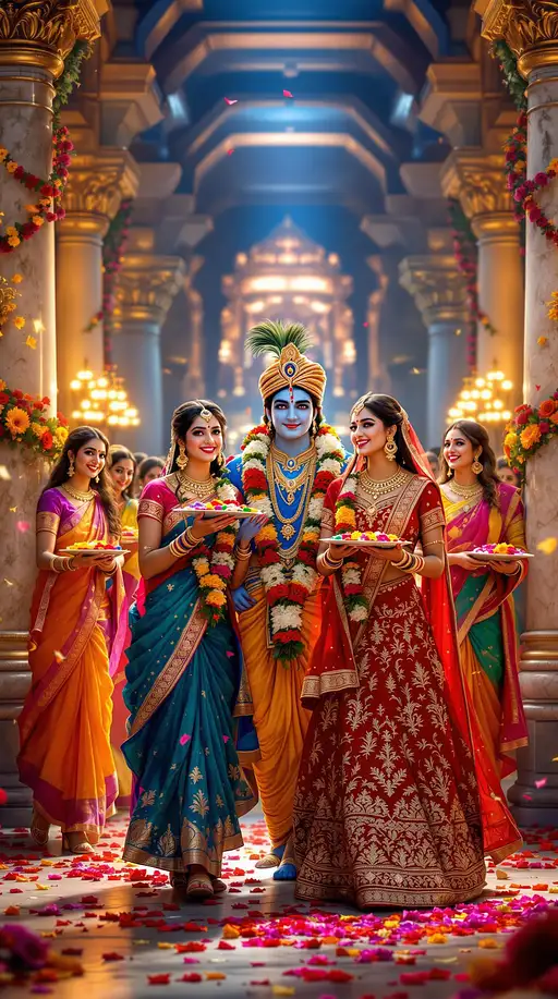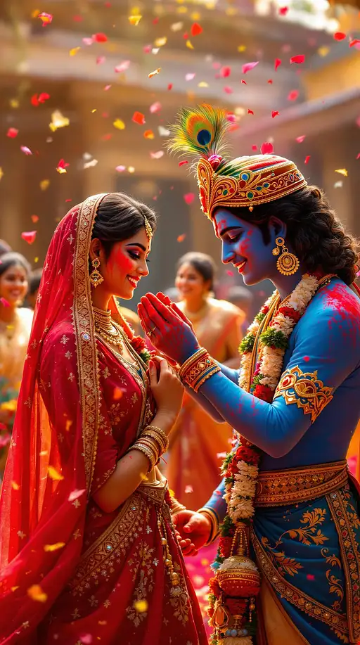 The image presents a full-body portrait of a stunningly beautiful chinese woman in an opulent, candle-lit boudoir with a strong East Asian aesthetic. The atmosphere is intimate, luxurious, and sensual, dominated by a rich color palette of deep reds, lustrous golds, and dramatic blacks. The woman is the undeniable focal point, her direct gaze and elaborate adornments creating a powerful and captivating presence. The image appears to be a hyper-realistic digital creation, notable for its flawless detail and romanticized style.\nThe Woman's Face, Hair, and Jewelry:\nThe woman has flawless, porcelain-like skin. Her facial features are striking, with large, luminous hazel-brown eyes accentuated by dramatic makeup. This includes dark, smoky eyeshadow, a sharp, winged eyeliner, and thick, long eyelashes that enhance their almond shape. Her eyebrows are perfectly arched and defined. A small, red jewel, resembling a bindi, is placed centrally on her forehead, just above her brows. Her lips are full and painted a vibrant, glossy crimson that matches the roses in her hair and the fabric around her.\nHer hair is a voluminous cascade of jet-black, healthy-looking waves. A portion is styled into a sophisticated updo at the crown of her head, secured with ornate golden floral pins. This updo is lavishly decorated with deep red roses that appear fresh and velvety, creating a beautiful contrast with her dark hair. Long, dangling earrings with golden tassel ends hang from her ears, framing her face and adding to the sense of regal opulence.\nAttire:\nShe wears an intricate piece of lingerie that blurs the line between clothing and body art. It's a teddy or bodysuit in a deep red and black. The cups of the bustier are a rich red with a subtle, textured pattern, possibly brocade or embroidered silk. This is framed by exquisite black lace with a delicate, scalloped edge. The lace forms a high, choker-like collar around her neck, which then descends to connect with the bust and continues down her torso in an elaborate pattern, revealing her midriff and navel through a sheer or open design.\nThe Body Painting in Detail:\nThe most remarkable feature of her adornment is the extensive and intricate body painting that covers a significant portion of her skin, appearing as a fusion of tattoos and gilded relief work.\nMaterials and Style: The artwork combines two distinct styles. The primary style uses a brilliant, metallic gold that appears thick and raised, almost like a bas-relief sculpture or applied gold leaf. It has a tangible texture that catches the candlelight with a warm, metallic sheen. This is contrasted and complemented by finer, more delicate patterns rendered in what looks like black ink, reminiscent of traditional tattoos or calligraphy.\nUpper Body Decoration: On her left upper chest and clavicle, a magnificent golden bird, likely a Fenghuang (a mythological Chinese phoenix), is depicted in mid-flight. Its wings are spread wide, showing meticulously detailed feathers, and its head is turned gracefully. This golden phoenix appears to be emerging from or soaring above swirling tendrils of black ink that resemble gnarled, leafless branches, which trace along her collarbone and down her shoulder.\nArm Adornments: Her right arm is adorned with a sleeve-like design. The black vine and branch motifs continue from her shoulder, wrapping around her bicep and forearm. Interspersed within these black lines are delicate touches of the same raised gold.\nTorso and Hip Decoration: The black lace of her lingerie seamlessly transitions into black ink patterns that swirl around her ribs. On her lower abdomen, below the navel, a large, symmetrical golden design echoes the ornate, filigree style of the lingerie's lace. This golden pattern sits prominently on her skin, drawing the eye.\nLeg and Thigh Art: The most substantial piece of body art is on her right thigh. Here, another large, mythical creature, possibly a second phoenix or a peacock, is rendered in the same stunning, raised gold. Its body is coiled, and its magnificent tail feathers flow down her leg in a breathtaking cascade of intricate swirls and flourishes. This central golden piece is surrounded by the more subdued black ink vines, which continue down her shin and calf, creating a cohesive and comprehensive design that covers her entire leg.\nSetting and Environment:\nThe woman is posed kneeling on a plush surface, likely a bed, which is draped in voluminous folds of a deep red, satin-like fabric. Scattered across this fabric are dozens of individual red rose petals, reinforcing the romantic and luxurious theme. The background is softly out of focus, enhancing the intimacy of the scene. One can discern the elements of a lavishly decorated room: tall, slender candles in ornate golden holders cast a warm, flickering glow, creating soft highlights and deep shadows. In the background, a traditional Chinese-style wooden window screen with a geometric lattice pattern is visible, grounding the scene in a specific cultural aesthetic. The overall environment is dark, warm, and richly textured, serving as the perfect backdrop for the radiant figure at its center.