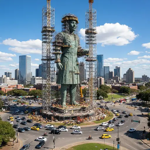 20 days ago An ultra-realistic, giant statue (based on the uploaded photo of the person) stands in the center of a busy city roundabout. The statue is still under construction, surrounded by towering silver scaffolding that reaches into the clouds. Many construction workers wearing safety helmets and orange reflective vests are climbing and working on it. The background is a realistic city scene. Cars and motorcycles are passing around the roundabout. The sky is blue and bright, a daytime scene, in a realistic style. kumera 3 73