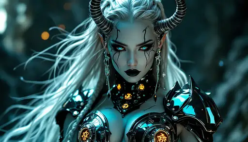 "Full body photo of Sedixia Mörth, alluring dark metal vocalist, ethereal beauty with demonic presence. Dramatic cinematic lighting, photorealistic 8K. Long flowing silver-white hair with obsidian streaks, framing elegant curved horns adorned with silver runes. Wild asymmetrical cascades with intricate warrior braids and metallic ornaments. Elegant pointed ears with multiple silver piercings and delicate chains. Tall, statuesque figure with voluptuous curves. Iridescent blue-green skin with intricate black ritualistic markings flowing from her eyes like dark tears. Mesmerizing violet eyes with feline pupils, radiating ancient power. Sculpted high cheekbones and striking features. Black chrome lipstick with metallic sheen. Generous bust emphasized by provocative neckline. Wearing a futuristic chrome armor ensemble with liquid metal effect - strategic cutouts and plunging neckline with intricate metalwork framing deep cleavage. Reflective chrome plates flowing like mercury across vital areas. Form-fitting armored corset with glowing occult symbols accentuating curves. Thigh-high chrome boots with silver accents. Dramatic cape of shredded silk billowing in unseen wind. Multiple layered silver necklaces bearing mystical runes resting on exposed décolleté. Powerful stance, confronting viewer with intense seductive gaze. Dark atmospheric setting with rolling purple-tinted mist. Looming Gothic cathedral architecture in background with flying buttresses and gargoyles. Hyperdetailed, cinematic composition emphasizing dark glamour and otherworldly beauty. Shot with perfect depth of field, ray-traced lighting emphasizing chrome reflections."