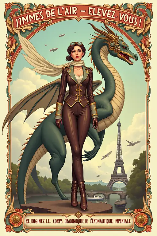 This is a magnificent and highly detailed digital artwork in the steampunk genre, portraying a confident and adventurous Japanese woman against the backdrop of a sprawling, fantastical metropolis.\nThe Central Figure:\nThe focal point is a beautiful young Caucasian woman standing in a three-quarters pose on a high balcony. Her expression is one of determination and forward-looking optimism as she gazes into the distance. Her voluminous brown hair, full of soft curls, is swept back by a gentle breeze.\nHer Steampunk Attire:\nHer outfit is a masterclass in steampunk fashion, intricately detailed and blending Victorian elegance with industrial pragmatism.\nJacket and Blouse: She wears an exquisitely tailored, double-breasted jacket made of rich brown leather. The jacket is adorned with numerous brass buttons, a high collar, and unique decorative elements on the lapels and cuffs. Underneath, a high-collared, pleated white blouse is visible.\nAccessories and Gadgets: Her attire is laden with classic steampunk accoutrements.\nGoggles: Perched on her head are a pair of ornate brass-and-leather goggles, a staple for any airship pilot or adventurer.\nChoker and Gloves: Around her neck is an intricate choker made of leather and brass components. She wears matching brown leather gloves with articulated, metallic-looking fingers and detailed cuffs.\nTrousers and Gear: She is wearing practical, fitted brown leather trousers. Draped over one hip is a darker fabric coat-tail or sash, to which a prominent brass gear mechanism is attached, hinting at her role as an engineer or inventor.\nOverall Look: The entire ensemble, with its layers of leather, brass, and intricate machinery, paints her as a capable and stylish protagonist in this mechanized world.\nThe Environment and Background:\nThe setting is as impressive and detailed as the character herself.\nThe Cityscape: She overlooks a vast and breathtaking steampunk city. The architecture is a grand fusion of Victorian design and industrial technology, featuring towering buildings with ornate domes, sharp spires, and intricate metalwork. The color palette of the city is dominated by bronze, gold, and stone, giving it a majestic and aged appearance.\nThe Airship: Hovering majestically in the sky above her is a colossal airship. Its underside, visible in great detail, is a complex construction of metallic panels, pipes, intricate filigree, and large mechanical components like hanging wheels and observation pods. It represents the pinnacle of technology in this world.\nThe Atmosphere: The scene is set during the day, under a blue sky with fluffy white clouds. The scale is epic, conveying a sense of adventure, progress, and a world where technology and artistry have merged. She stands on a high balcony with a brass and iron railing, positioning her as an observer or a key player in this grand vista.\nOverall Mood and Style:\nThe artwork exudes a sense of grand adventure, innovation, and romanticism. The highly detailed rendering, the cohesive color palette of browns, brass, and blues, and the heroic posture of the woman all combine to create a powerful and inspiring image that fully encapsulates the spirit of the steampunk