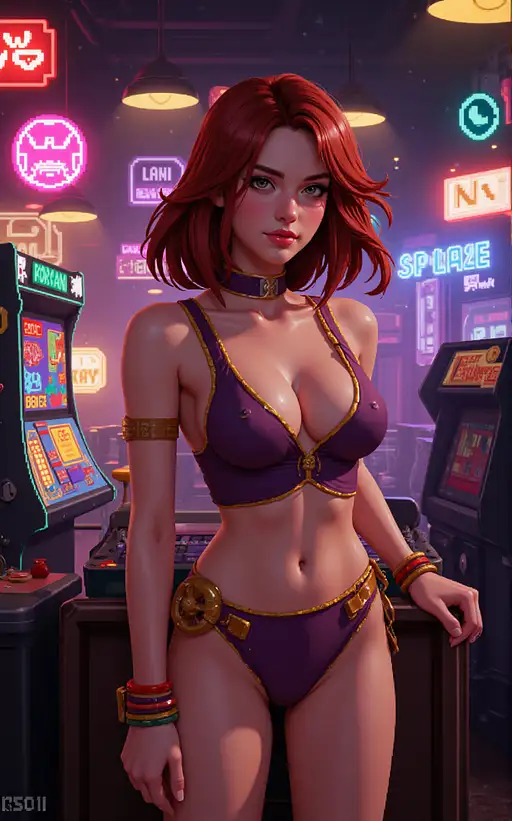 5 hours ago In a nostalgic retro arcade setting, a woman stands illuminated by the glow of vibrant pixelated screens, her figure crafted in detailed 8-bit pixel art. She has flowing shoulder-length hair with a playful bounce, rendered in bold pixel blocks that shimmer with subtle highlights. Her body is curvy yet athletic, the kind of strong, confident build that instantly makes her presence recognizable within the playful, nostalgic world. She wears a daring low-cut outfit, the neckline dipping just enough to emphasize her femininity while staying true to the exaggerated style of classic arcade characters. The outfit itself is stylized in bright, contrasting colors that pop against the pixel grid, with blocky accessories that suggest both fantasy and retro gaming charm. The background is alive with neon pixel signs, glowing arcade machines, and a warm nostalgic haze that wraps the entire scene in the charm of a vintage video game brought to life. Genie79 0 4