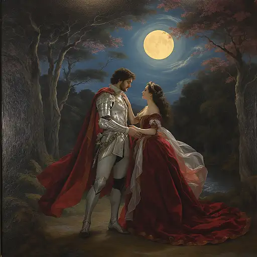 4 months ago Uma pintura delicada em estilo barroco mostra um cavaleiro ajoelhado diante de uma dama nobre sob a luz prateada da lua cheia. Eles estão em um jardim cercado por altos ciprestes e colunas de mármore, suavemente envolvidos por névoas esvoaçantes. O cavaleiro, com armadura de prata ornamentada e capa de veludo escuro, curva-se com devoção, tocando levemente os dedos da dama. Ela usa um vestido vermelho profundo, com bordados dourados finos que brilham sob o luar, e longos véus translúcidos que dançam com a brisa noturna. Seus olhares se encontram com intensidade silenciosa, expressando as palavras: “Meu coração se ajoelha ao toque suave do teu gesto.” A atmosfera é onírica, romântica e refinada, com pinceladas suaves, brilho lunar e elegância barroca. Morgue PRO 0 25