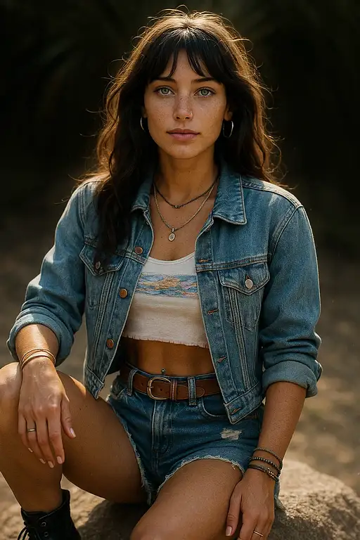 Material interactions and small-scale details: denim shows diagonal twill lines and stitch rows, frayed cotton fibers on the shorts’ hems and tiny loose threads at seam ends, metal surfaces (buttons, buckle, hoop earrings) display small scratches and tiny reflections of the surrounding light, skin pores and faint vellus hairs visible in high-resolution areas of face and forearm, a few grains of dust and faint sand specks on the rock near her boot, minute sunlit particles suspended in front of the blurred background.