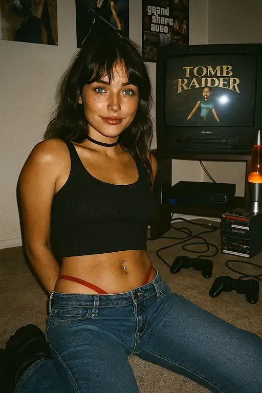 Sahara’s facial features: her eyes are bright, cool blue with a hint of grey, slightly almond-shaped with naturally curled lashes and softly defined brows. Her nose is delicate and narrow with a softly rounded tip, clearly adorned with a small silver nose ring piercing on her left nostril that catches the light with a subtle metallic reflection. Her lips are full with natural fine lines, warm rose-brown in color. Her skin has a warm, sun-kissed bronze tone with visible freckles, natural pores, faint veins, and a subtle sheen. Distinct tan lines trace along her shoulders, hips, and bikini zone, evoking the look of long summer days and adding to the raw candid authenticity. Her deep brunette hair is long and wavy with curtain bangs, a few realistic flyaways framing her face, humidity-reactive strands catching light. Her midsection is accented by a small belly button piercing with two blue diamond-like gemstones — one above and one below — sparkling subtly in the light.