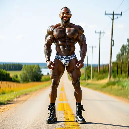 4 months ago Full body image, tall fit slim bodybuilder, heavily tattooed, slim face, chiseled jawline, shaved head, big dick in camouflage print thong underwear, big feet in black combat boots, big smile, standing outside on dirt road cdd0f500d69 0 11