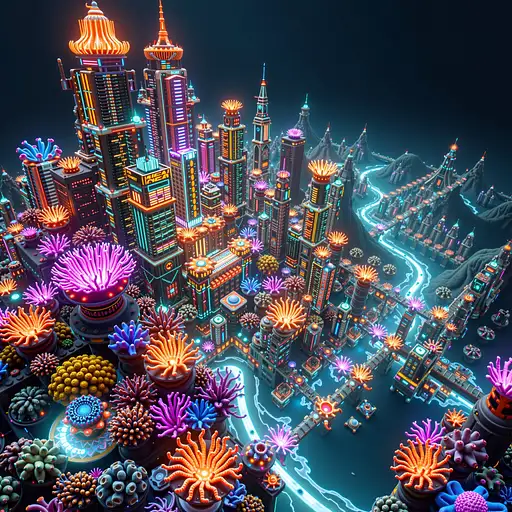 4 months ago A bustling cyberpunk cityscape made entirely of vibrant, glowing coral reefs and sea creatures, urban sprawl meets underwater bioluminescence, surreal, detailed.âââ The_Promptonaut 1 24