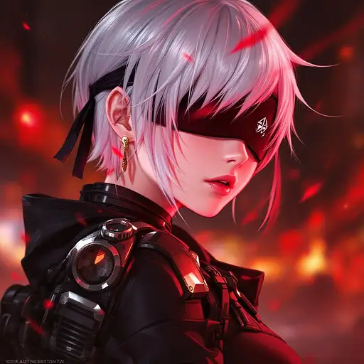 The figure’s serene, unreadable face is hidden behind a blindfold. Their outstretched hand releases a black origami bird mid-flight, its wings unfurling as if ready to pierce the silence. Below the cliff, an endless abyss swirls with broken reflections, abstract glyphs, and ink-like patterns. The atmosphere feels carved from frost and smoke.