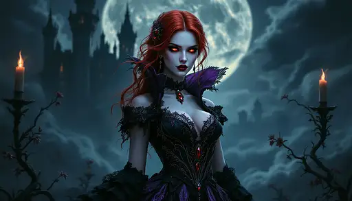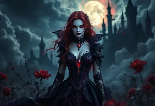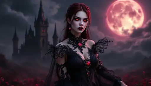 an ultra-realistic, full-body portrait of a captivating gothic vampire woman, radiating seductive power and chilling elegance. Her form exudes immortal grace and supernatural authority, posed with an alluring intensity that commands attention. She wears a flowing gown crafted from luxurious deep red velvet, interwoven with intricate black lace, sharp metallic accents, and demonic sigils. The gown’s design merges opulence and danger, featuring elaborate patterns, flexible armor-like plating, and hidden compartments, perfectly suited for both seduction and deadly vampiric abilities. Her photorealistic face is a masterpiece of allure and menace, with sharp, defined features, flawless porcelain skin, and piercing crimson eyes that gleam with immortal power and dark intent. Her long, black hair cascades down her shoulders in voluminous curls, adorned with delicate silver hairpins and sharp obsidian spikes that seem to pulsate with captured dark energy. Ethereal gothic tattoos in swirling silver and black patterns trace elegantly along her arms and neck, adding a sinister yet seductive charm. She holds a gleaming silver chalice filled with crimson liquid, its surface etched with ancient runes, and a concealed retractable blade that hints at her readiness for both intimate seduction and deadly combat. Her presence is both mesmerizing and fearsome, blending timeless beauty with lethal grace. The background showcases the grand interior of a gothic mansion, with towering arches, ornate furnishings, and flickering candlelight casting dramatic shadows. Swirling abstract shapes in deep crimson, black, and silver shift around her, adding an ethereal and supernatural atmosphere. The cinematic lighting highlights the richness of her gown, the gleam of her accessories, and the haunting glow of her tattoos, casting soft highlights and deep, sharp shadows that emphasize her form and commanding presence. Rendered using advanced digital artistry techniques, including V-Ray tracing, Unreal Engine 5 rendering, and Substance Painter texturing, this image captures every intricate detail, from the luxurious textures of her gown to the dynamic interplay of light and shadow. The composition blends gothic horror with futuristic realism, creating an extraordinary full-body portrait in UHD resolution that showcases her as a powerful, elegant, and immortal gothic vampire.