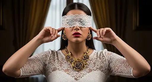 The figure’s serene, unreadable face is hidden behind a blindfold. Their outstretched hand releases a black origami bird mid-flight, its wings unfurling as if ready to pierce the silence. Below the cliff, an endless abyss swirls with broken reflections, abstract glyphs, and ink-like patterns. The atmosphere feels carved from frost and smoke.