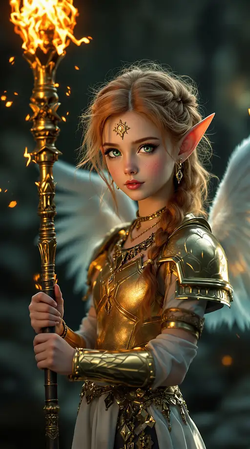 A stunning professional photograph captures the world's most beautiful second-grade girl as the dwarf Guardian Angel, radiating ethereal beauty with delicate wings. Her porcelain light olive skin glows softly with a golden hue, while her crystal-green eyes twinkling, shine with innocence and divine wonder. She appears as a Caucasian tenth-grade girl, featuring striking green-blue-purple eyes, glossy lips, freckles, bold black eyeliner, exceptionally long lashes, and a subtle pink blush that enhances her luminous, glass-like complexion. Her long, wavy ginger hair is accented with dark blue and blonde streaks in a waterfall braid, complemented by golden necklaces. She wears a lightly red golden armored shirt, and matching gold skinny leggings, holding the staff of mercy, standing at the gates of the underworld. Created using Unreal Engine 5 and Octane Render, this high-resolution image boasts intricate details, ultra-sharp focus, and dramatic volumetric lighting. The artwork is a masterpiece of photo-realism, showcasing a full-body, front view with perfect graphics and extraordinary detail. Negative prompt: Asian-Less-Neg bad-artist bad-artist-anime bad-hands-5 bad pictures bad_prompt_version2 badhandv4 By bad artist -neg Cyber-Realistic Negative-neg Easy Negative hand-neg ng_deepnegative_v1_75t verybadimagenegative_v1.3, low resolution, text, errors, cropped, poorest quality, low quality, jpeg artifacts, unattractive, duplicates, morbid, mutilated, out of frame, extra fingers, mutated hands, poorly drawn hands, poorly drawn face, mutation, deformity, blurry, dehydrated, incorrect anatomy, incorrect proportions, extra limbs, cloned face, disfigured, disproportionate, malformed limbs, missing arms, missing legs, extra arms, extra legs, fused fingers, excessive fingers, elongated neck, username, watermark, signature