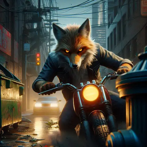 6 months ago Dramatic professional cinematic 3D animation of a fox man with intense amber eyes and long fur driving a car behind a hydrant in an alley behind a dumpster and a motorcycle in a tropical city on a beach fdfd42df7ad 1 21