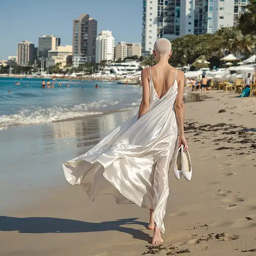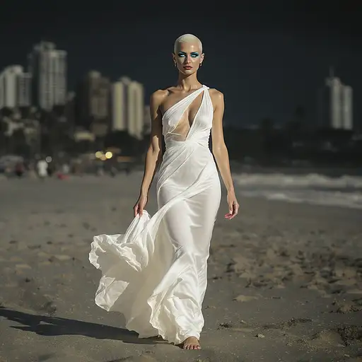 15 days ago 4K ultra-detailed cinematic portrait of Lilas, a tall, slender mature woman with a perfectly shaved buzz cut and luminous white hair. Her eyes have a gradient color of blue. She gracefully dons a flowing, very translucent white gown at the city beach, walking barefoot on the sand with her shoes in hand. The chiaroscuro lighting emphasizes her slender form, casting deep shadows across the beach. The scene bursts with vibrant, liquid sun tones and cinematic bokeh, enhanced by precise, sharp focus and masterful volumetric lighting. Every detail from her flawless anatomy to the dynamic elegance of her presence unfolds in a candid, creative style that feels like a living masterpiece. score_13, score_28_up, score_37_up. photography. portraiture. catch light in eyes. one flash. rembrandt lighting. Soft box. dark shadows. High contrast. 80mm lens. F2.8. Lilas_was_here 1 24