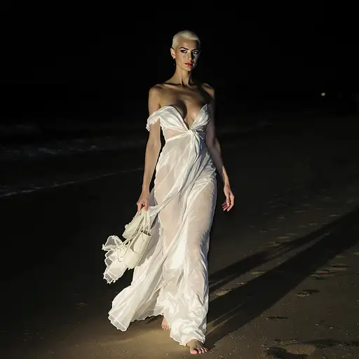15 days ago 4K ultra-detailed cinematic portrait of Lilas, a tall, slender mature woman with a perfectly shaved buzz cut and luminous white hair. Her eyes have a gradient color of blue. She gracefully dons a flowing, very translucent white gown at the city beach, walking barefoot on the sand with her shoes in hand. The chiaroscuro lighting emphasizes her slender form, casting deep shadows across the beach. The scene bursts with vibrant, liquid sun tones and cinematic bokeh, enhanced by precise, sharp focus and masterful volumetric lighting. Every detail from her flawless anatomy to the dynamic elegance of her presence unfolds in a candid, creative style that feels like a living masterpiece. score_13, score_28_up, score_37_up. photography. portraiture. catch light in eyes. one flash. rembrandt lighting. Soft box. dark shadows. High contrast. 80mm lens. F2.8. Lilas_was_here 0 17