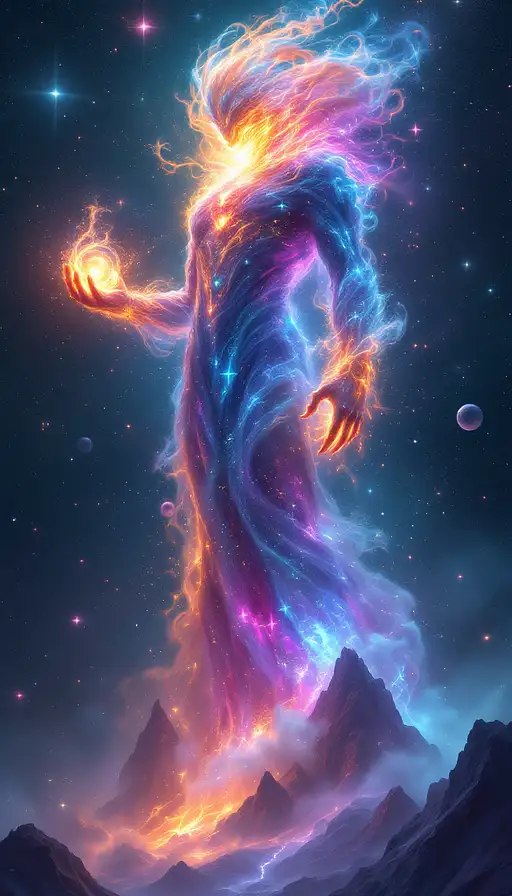 (Ultra-high resolution, Hyper-detailed cosmic artwork, Cosmic energy deity in starlit void:1.5) a towering humanoid figure formed from swirling nebulae, stardust, and radiant cosmic energy. The figure emanates an otherworldly presence, with vibrant hues of blue, purple, pink, and fiery orange blending seamlessly across its luminous form. Intense, glowing eyes pierce through the cosmic expanse, radiating with a powerful celestial light. One hand holds a radiant orb of energy, pulsating with intricate patterns and glowing brighter than the surrounding stars. The other hand is outstretched, releasing tendrils of cosmic energy that twist and flow outward, merging with the surrounding starlit void. Ethereal mist and glowing particles swirl around the figure, enhancing its ethereal majesty. The background features a vast, starry cosmos filled with scattered celestial bodies and glowing stars, adding depth and grandeur to the scene. At the base of the towering figure, majestic glowing mountain-like formations rise, their peaks illuminated by the figure's radiant energy. Smooth gradients and light trails flow across the scene, creating a sense of depth, motion, and dynamic energy. The interplay of vibrant colors and glowing elements forms a surreal and awe-inspiring atmosphere, perfectly capturing the deity’s cosmic power and majesty. Rendered with hyper-realistic precision and intricate details, this artwork is an immersive and visually stunning portrayal of a cosmic entity that embodies the infinite beauty and boundlessness of the universe.