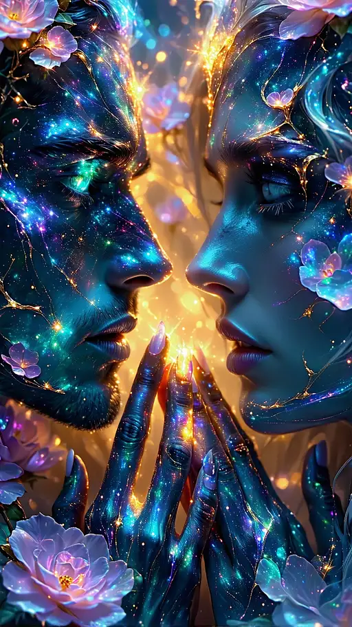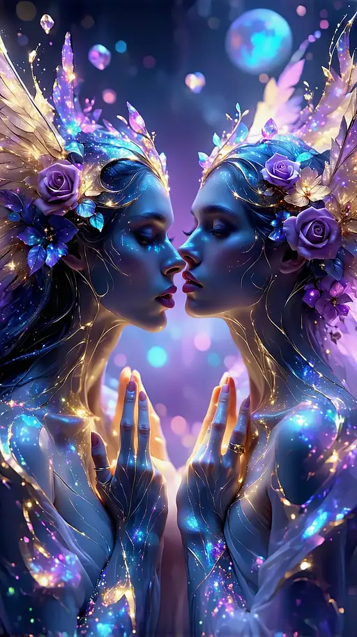 hyper-realistic gold, opal quartz, neon hues, silver holographic reflections, and cosmic textures, Two celestial beings with bodies made of swirling galaxies reach for each other, their fingertips melting into golden liquid light. Above them, a divine entity with radiant wings oversees their fate. Floating roses bloom and dissolve in the air, forming patterns of sacred geometry. The sky shimmers in deep violet, electric blue, and glowing opal hues. Salvador Dalí surrealism, highly detailed, ethereal, 4K. Salvador Dalí-Inspired Surrealism, optimized for maximum detail and dreamlike quality. Each prompt follows a structured format, ensuring consistent surrealistic themes, psychedelic aesthetics, and celestial mysticism.