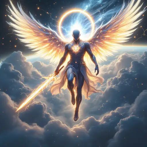Ultra-realistic male figure, full-body, a superintelligent hybrid entity – half alien, half Atlantean, radiant light wings, intricate plasma and weightless fabric robes, holding a sun-reflecting sword in his right hand, floating between sky and earth, above him cosmic space, stars, darkness, sunrise halo of lightning around his head, glowing neon glyphs, below him planet Earth with city lights, running across clouds, mist and electric discharges, fantasy setting, hyper-detailed, silver edges, cinematic lighting --v 6 --ar 2:3 --style raw --q 2 --hd