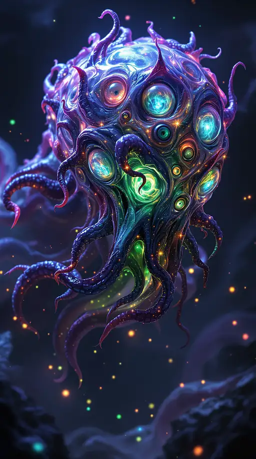 a hyper-realistic depiction of a terrifying interdimensional monster, its grotesque and otherworldly form captured in exquisite detail. The creature features a chaotic array of multiple eyes, each glowing faintly with an eerie luminescence, and writhing tentacles that twist and undulate with a sense of unsettling life. Its partially translucent body reveals swirling inner cosmic energy, resembling miniature galaxies, glowing nebulae, and pulsating orbs of bioluminescent light. The monster's skin is rendered with intricate, lifelike textures, blending a horrifying mix of slimy surfaces, scaled patches, and otherworldly patterns that shift subtly under the light. Its form is coated in reflective, wet-looking slime, emphasizing its alien biology. The color palette is dominated by deep purples, electric blues, and bioluminescent greens, creating a vivid and surreal aesthetic that highlights its interdimensional origin. The scene is captured with the precision of a high-end DSLR camera in stunning 8K resolution, showcasing every minute detail of the creature’s skin, glowing eyes, and inner energy. A shallow depth of field blurs the background slightly, enhancing the focus on the monster and adding a cinematic quality to the composition. Photorealistic lighting effects illuminate the creature, with dynamic light reflecting off its slimy skin and casting eerie shadows across its tentacles. Subtle, glowing atmospheric particles surround the monster, enhancing the sense of cosmic horror. The lighting creates a chilling interplay of highlights and shadows, further emphasizing its unearthly presence. The overall atmosphere is dark and foreboding, evoking a sense of awe and terror as the viewer confronts this cosmic entity. The combination of hyper-realistic textures, dynamic lighting, and an otherworldly aesthetic delivers a haunting masterpiece that embodies the essence of interdimensional horror.