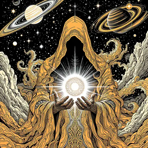 Create a surreal, highly detailed solar system scene. The composition should feature intricate line work in orange and white tones, with clear, defined details. The central figure is a hooded, faceless entity shrouded in shadows, with piercing, hidden eyes. The figure should appear massive, as if a celestial guardian, holding a glowing orb of energy symbolizing the Sun, radiating intricate energy lines. Surround the entity with swirling planetary orbits, each featuring detailed, ornate designs and unique textures for every planet, from rocky craters to gaseous clouds. The background includes a night sky filled with stars, swirling nebulae, and cryptic, ancient runes etched into the fabric of space. Add celestial rings, asteroid belts, and glowing mystical symbols orbiting the scene to emphasize the otherworldly aesthetic. The overall style should remain delicate and complex, with a sense of cosmic mystery and immense power, perfect for a coloring book's black-and-white line art format.